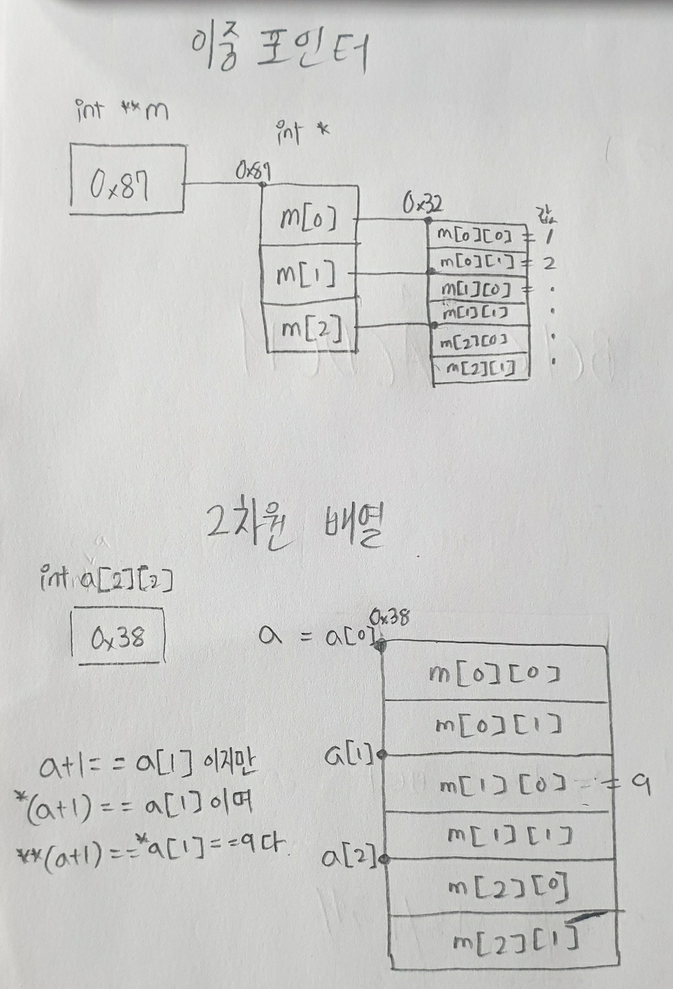 (ex 2차원 배열에는 a = a[0] 이지만 *a != *a[0] 같은 약속이 있음. **a 해야 값 참조 가능.)