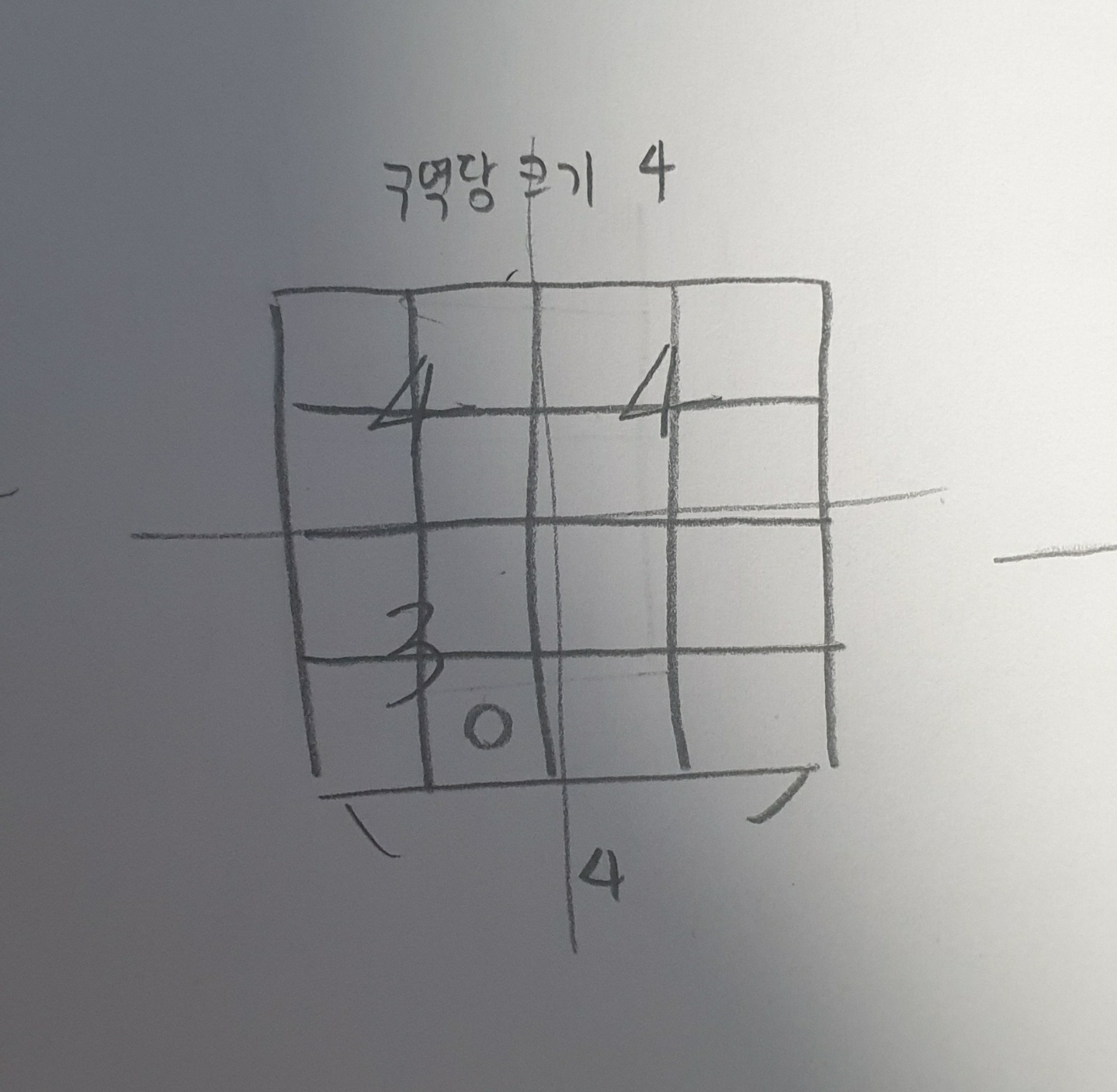 2. (현재 변의 길이 / 2)^2 을 구역 당 크기로 계산해도 되겠다.