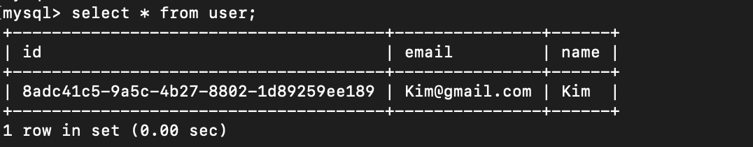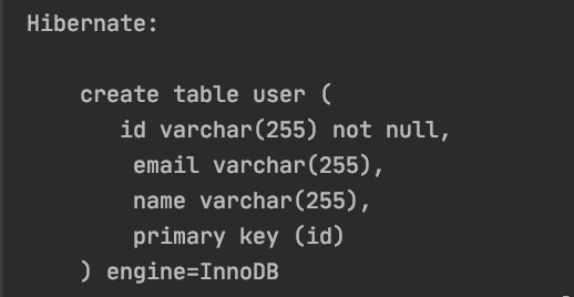 CREATE TABLE User( id VARCHAR(255) NOT NULL, name VARCHAR(255) NOT NULL, email VARCHAR(255) NOT NULL, PRIMARY KEY(id));