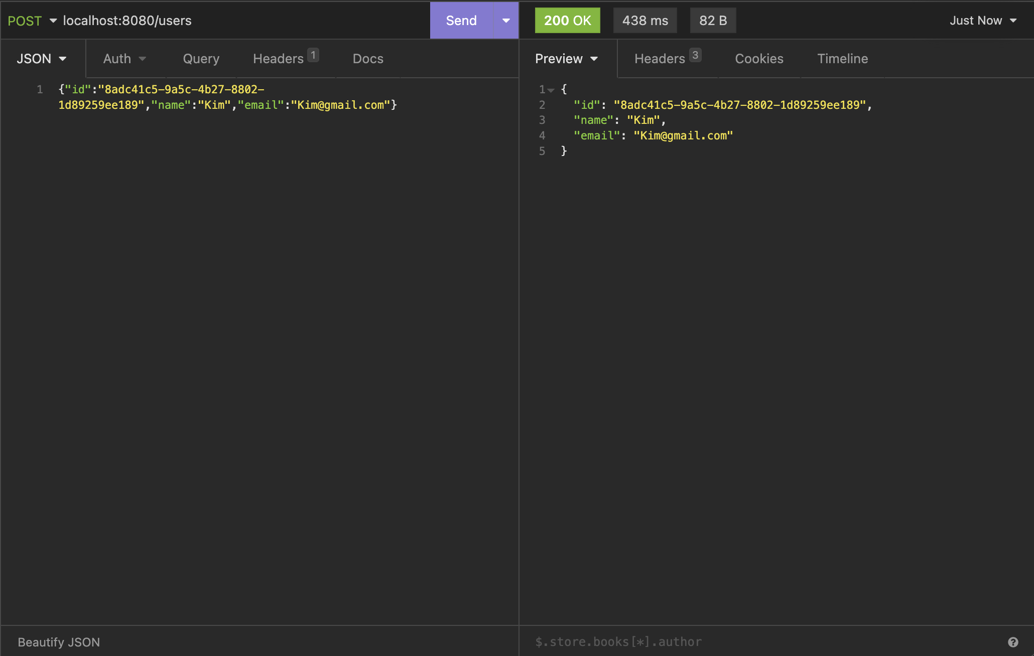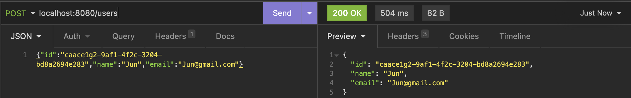 성공적으로 생성이 되어서, 데이터가 그대로 반환된 것을 확인할 수 있고