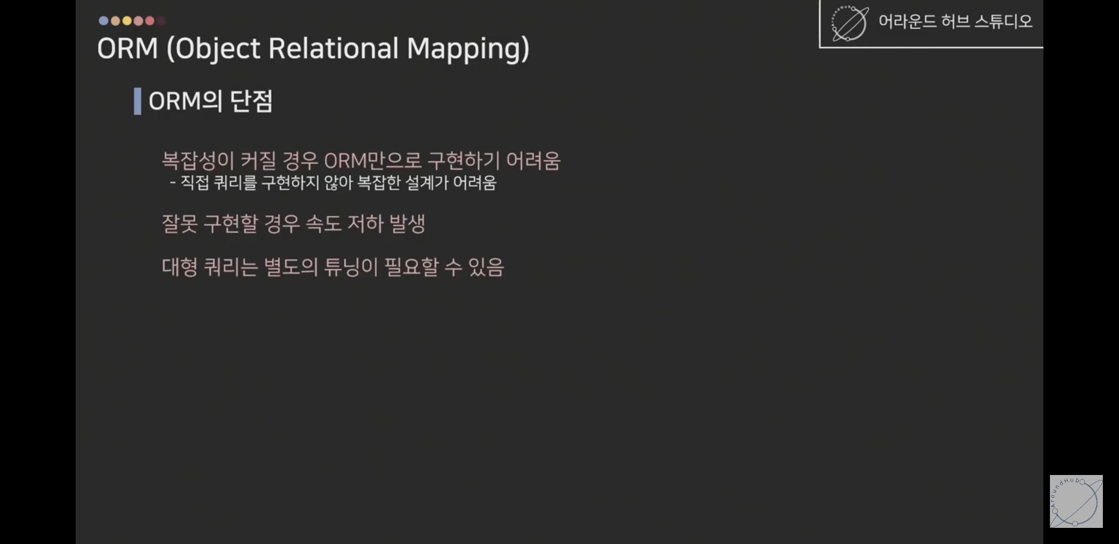 복잡성이 커질 경우 ORM만으로 구현이 어려움 -> 그렇기 때문에 직접 쿼리문을 하드코딩해야하는 경우가 당연히 있음.