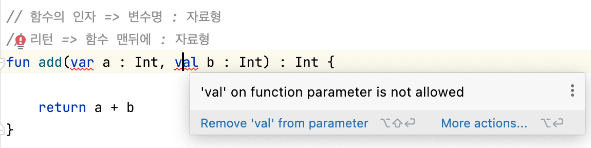 아까 1에서 봤던 함수의 인자에서는 val이나 var를 명시할 수 없다.